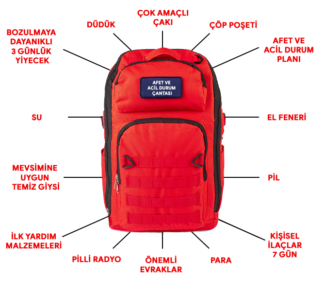 Afet ve acil durum çantasını 6 ayda bir belirli periyotlar halinde mevsim koşullarına göre kontrol edin.